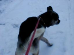 生まれてはじめての雪体験。 しかしなんだか無感動のチロ。はしゃぐでも なく、いつもと変わりなく散歩をこなしていく。 この白さを不思議と思わないのだろうか? この白さに感動を覚えないのだろうか? 「いやー、今日は寒いなぁ。」ぐらいには思って いろのだろうが、雪ぐらいでは驚かないぞ! ってな感じのチロ。 |